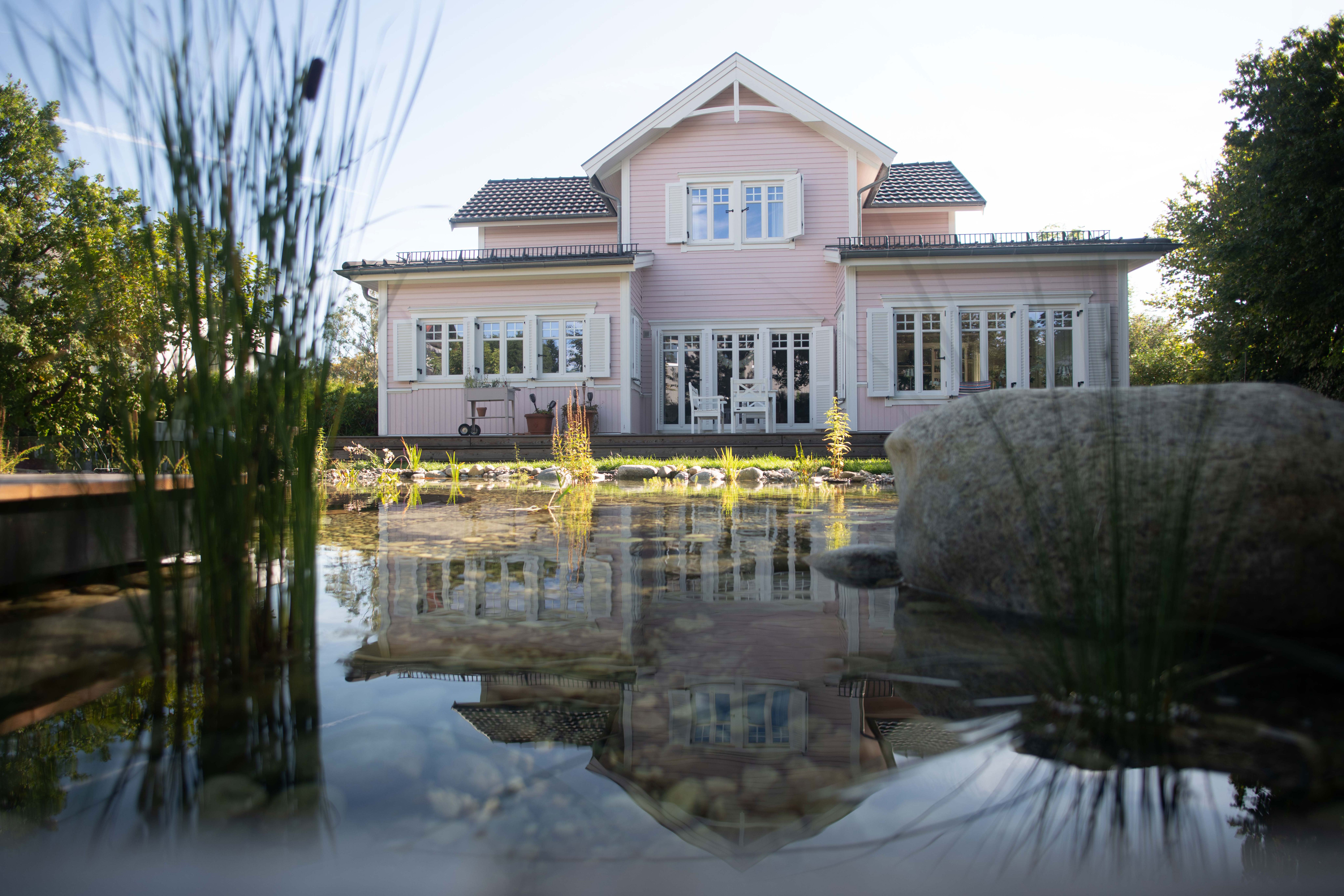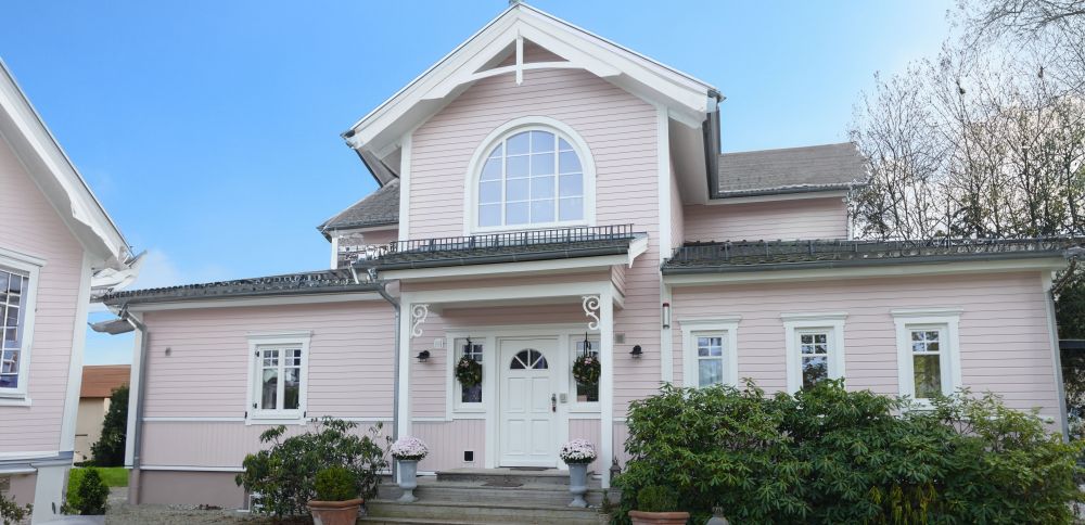 Wenn Häuser gut gestaltet und in Ihrer Proportion stimmig sind, lächeln sie uns an. Hier ein schönes Beispiel eines schwedischen Holzhauses im bayerischen Voralpenland. Mit großer Sorgfalt wurde dieses Haus nach einem Hagelschaden gründlich vom alten Anstrich erlöst und mit einer Pflanzenfarbe auf Leinölbasis liebevoll komplett neu gestaltet. Welch eine Freude für die Bewohner und jeden Besucher.