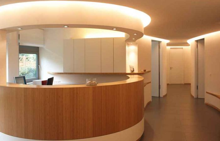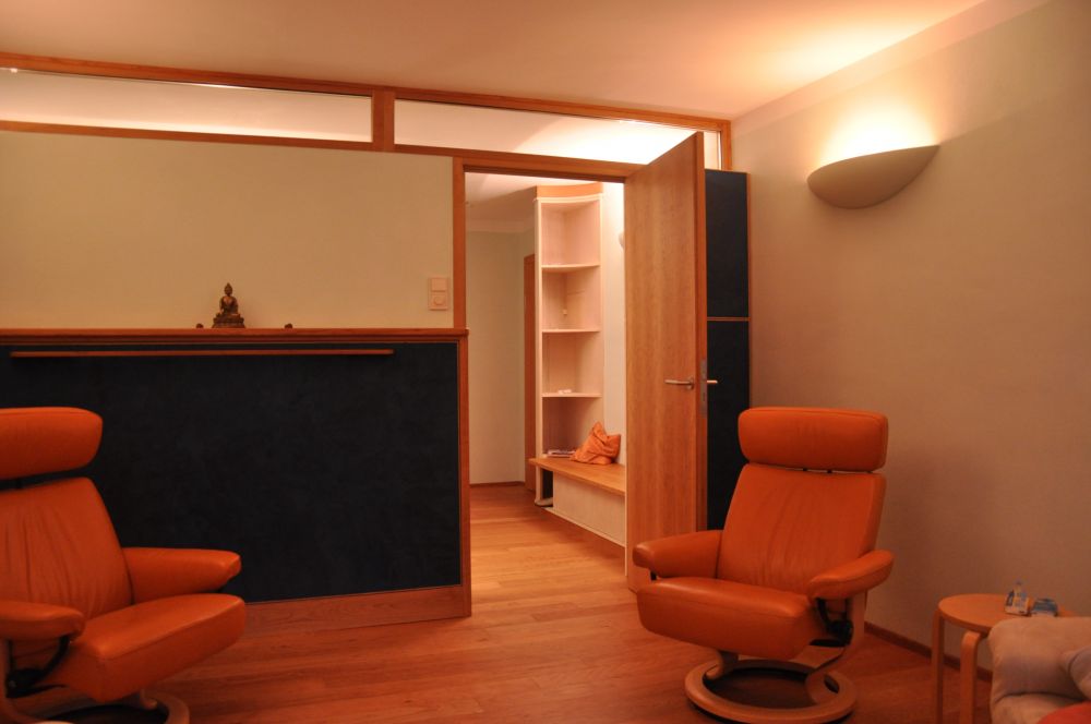 Nach Entkernung der Praxisräume und elektrobiologischer Abschirmung erfolgte ein Wandaufbau aus Lehm und Kalk. Für die Basis dieser Praxis wurde ein mondphasengeschlagenes Holz aus heimischer Kirsche gewählt. Die kräftige, warme Farbe unterstützt das Sicherheitsgefühl im Raum, die Frucht der Kirsche das Wachstum der Persönlichkeit.